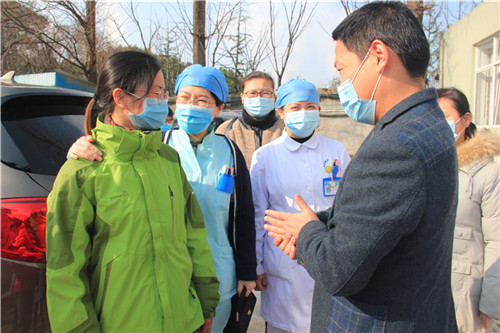得知消息的醫(yī)院同事、家屬紛紛從家里趕來,為了防止聚集,他們自覺地散在體檢大廳和外廣場,為隊(duì)員打氣、鼓勁,送戰(zhàn)友出征。在即將奔赴湖北抗疫第一線的離別時刻,我們的三位白衣勇士與大家揮手告別。每一句叮囑都記在心上,每一句鼓勵都化作動力。