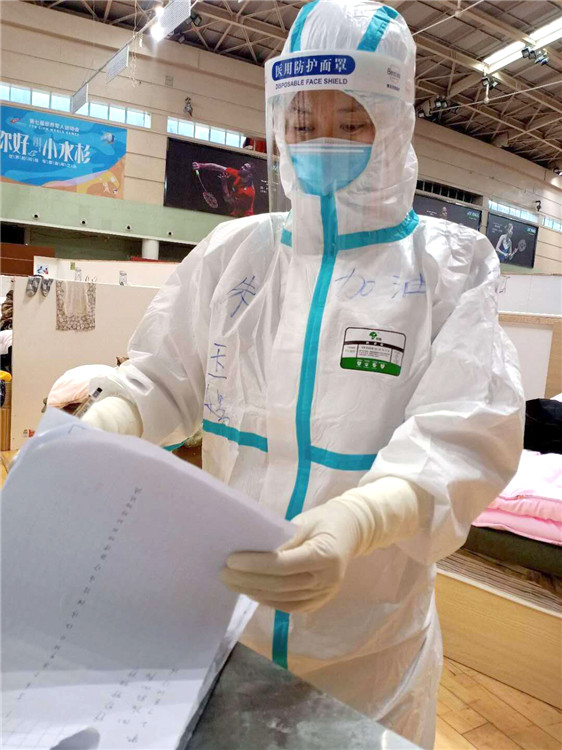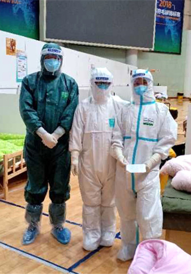 2月12日下午4點(diǎn),武漢市開(kāi)發(fā)區(qū)體育中心方艙醫(yī)院正式啟用,在仔細(xì)穿戴隔離衣、防護(hù)服、護(hù)目面屏等防護(hù)裝備后,朱玉娣第一次進(jìn)艙??吹劫即蟮捏w育館空蕩蕩的,此時(shí),還沒(méi)有病人進(jìn)來(lái),醫(yī)護(hù)人員卻已經(jīng)忙碌起來(lái),將前期準(zhǔn)備工作做好。4點(diǎn)40分,第一批約30名確診新冠肺炎病人進(jìn)艙,朱玉娣和隊(duì)友們趕緊為他們辦理入院登記,帶他們到自己的床位,給他們鋪床,幫助領(lǐng)取基本生活用品,交代入院注意事項(xiàng),測(cè)量體溫、血氧飽和度、血壓等,同時(shí)通知床位醫(yī)生。安排好這一切,第二批、第三批病人也陸續(xù)進(jìn)艙。這個(gè)忙碌的夜晚讓朱玉娣久久難忘,快速適應(yīng)陌生的環(huán)境并投入緊張的工作,穿梭在病人間,不停地溝通交流、搬運(yùn)東西。不知不覺(jué)已經(jīng)到了深夜10點(diǎn)半下班時(shí)間,在接班醫(yī)護(hù)人員的催促下,交接完自己區(qū)的病人后,相互鼓勵(lì)加油,朱玉娣和隊(duì)友出艙。出艙后,每個(gè)隊(duì)員額面上、耳朵上都有著深深的壓痕,身上的手術(shù)衣被汗水浸濕。這天晚上,體育中心方艙共收治了377個(gè)確診病人。
