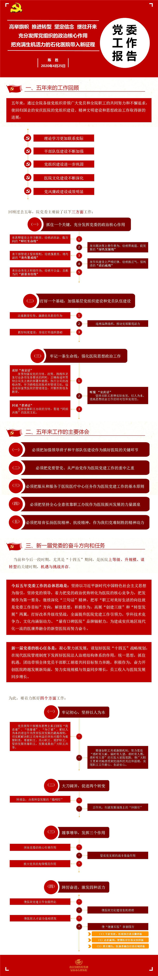 黨委書記陳勝代表醫(yī)院黨委向大會作了題為《高舉旗幟 推進轉(zhuǎn)型 堅定信念 繼往開來 充分發(fā)揮黨組織的政治核心作用 把充滿生機活力的石化醫(yī)院帶入新征程》的報告。報告回顧總結(jié)了5年來醫(yī)院黨委工作情況,客觀分析了存在的差距和薄弱環(huán)節(jié),明確了未來5年新一屆黨委的奮斗方向和任務(wù),號召全院各級黨組織和廣大黨員干部職工凝心聚力,頑強拼搏,為譜寫醫(yī)院轉(zhuǎn)型跨越升級新篇章、創(chuàng)造石醫(yī)人的幸福美滿新生活而不懈奮斗。