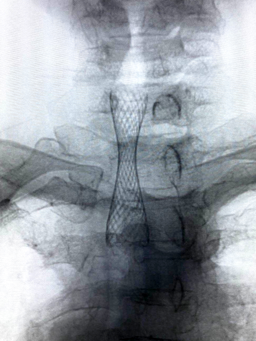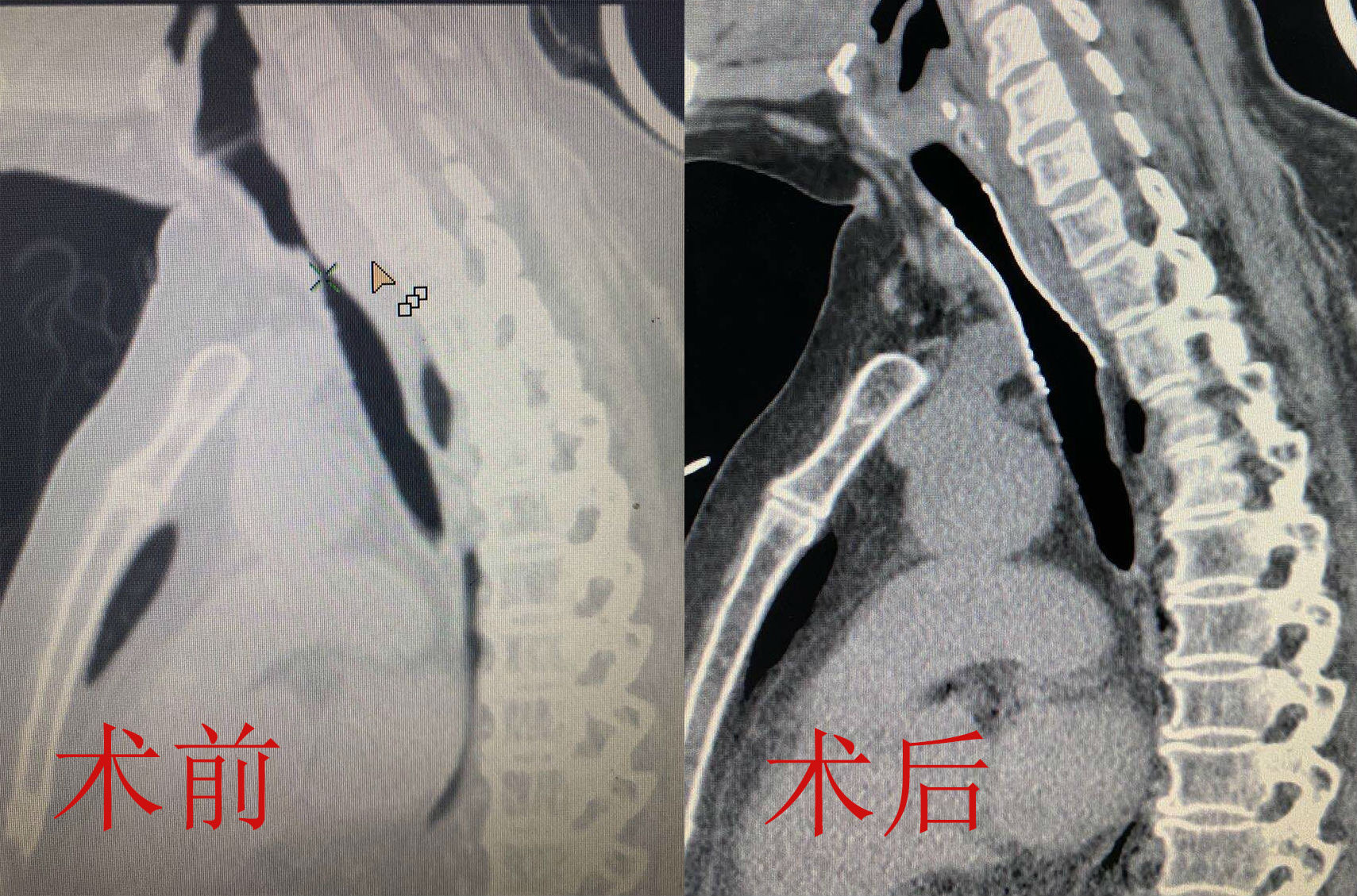 支架植入時,患者的氣管會被臨時堵塞,如何冷靜、準(zhǔn)確地在短時間內(nèi)快速釋放支架,為患者撐起一線生機,術(shù)者的技術(shù)和經(jīng)驗至關(guān)重要。同時,該患者氣管狹窄位置較高,若支架植入過低,則不能發(fā)揮效果;若支架植入過高,術(shù)后咽部刺激感明顯,依然不能提高生活質(zhì)量。因此,精確定位支架也是此次手術(shù)的一大難點。