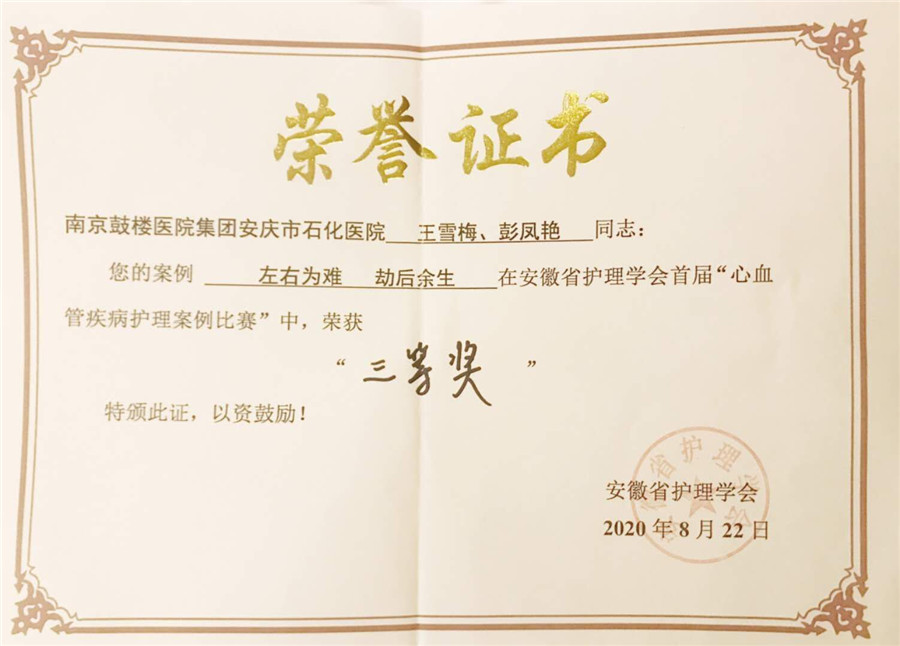 8月21日至23日,第二屆“儒道心學(xué)”國(guó)際心血管病學(xué)會(huì)議在合肥舉行。此次大會(huì)由安徽省醫(yī)學(xué)會(huì)、安徽省醫(yī)師協(xié)會(huì)、中國(guó)心血管健康聯(lián)盟、蘇州工業(yè)園區(qū)心血管健康研究院共同舉辦,期間,還開展了各種形式的學(xué)術(shù)病例競(jìng)賽。我院心血管內(nèi)科護(hù)士長(zhǎng)彭鳳艷、主管護(hù)師王雪梅代表醫(yī)院,參加了2020年安徽省護(hù)理學(xué)會(huì)首屆心血管疾病護(hù)理案例比賽,并取得了三等獎(jiǎng)的好成績(jī)。