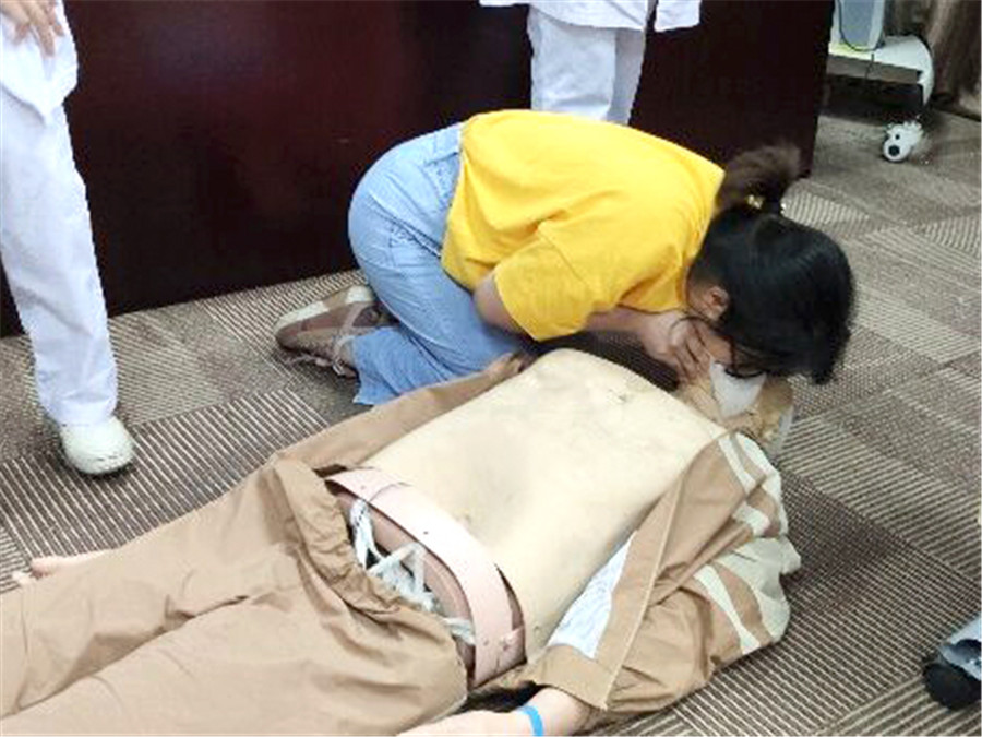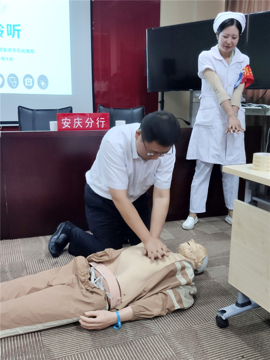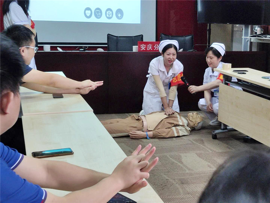“心臟驟停一旦發(fā)生,如得不到即刻有效的搶救復(fù)蘇,4-6分鐘后就會(huì)造成患者腦和其他重要器官組織的不可逆損害。因此,心臟驟停后的心肺復(fù)蘇必須在現(xiàn)場(chǎng)立即進(jìn)行?!狈阶o(hù)士長(zhǎng)為招商銀行的員工們?cè)敿?xì)講解了心肺復(fù)蘇相關(guān)的理論知識(shí),耐心分析并演示了徒手心肺復(fù)蘇每一個(gè)環(huán)節(jié)的體位及各種手法等細(xì)節(jié)。梁老師則就日常生活中突發(fā)疾病的急救措施,與大家積極互動(dòng)交流,逐一答疑解惑。大家聽得認(rèn)真、學(xué)得仔細(xì),在桂老師的指導(dǎo)下,紛紛上前進(jìn)行實(shí)操演練。