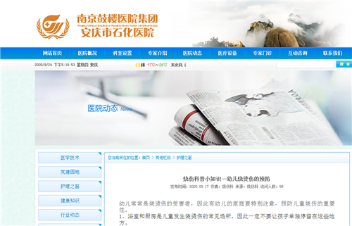 917日,護理部利用醫(yī)院網(wǎng)站的“護理之窗”版塊,為百姓科普燒燙傷防治知識,“你需要知道的燒傷自救常識”、“燒傷科普小知識——家庭康復治療篇”、“燒傷科普小知識——幼兒燒燙傷的預防”等內(nèi)容淺顯易懂,干貨滿滿。