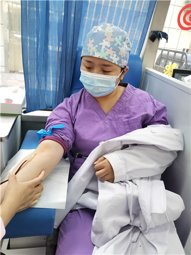 他們有的穿著工作服就來(lái)了,有的剛下夜班,還有的休假在家專(zhuān)程趕回醫(yī)院;他們中有醫(yī)生、護(hù)士等醫(yī)務(wù)人員,也有行政、保安、后勤等工作人員。經(jīng)體檢、初篩合格后,大家紛紛伸手捋袖,獻(xiàn)出殷紅、溫暖的鮮血。