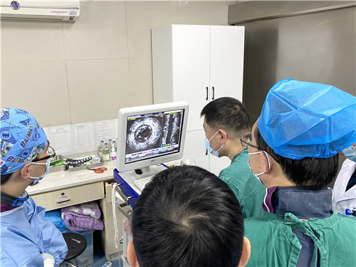 入院完善相關檢查后,由宋主任親自為方阿姨行微創(chuàng)球囊治療。憑借多年的經驗和手感,導絲在宋主任的手里一點一點前行,終于穿過完全閉塞的右冠狀動脈。擴張球囊,行血管內超聲發(fā)現,此次發(fā)生支架內再狹窄,是因為此前植入的支架選擇偏小,導致其不能牢固地粘著在血管壁上。找到了問題的癥結,宋主任果斷選擇更大號的球囊進行充分擴張,配合切割球囊對血管壁上的動脈粥樣硬化斑塊進行切割處理,再于狹窄段選用藥物球囊進行治療。復查造影顯示,血流恢復暢通,再次行血管內超聲檢查,支架貼壁良好。