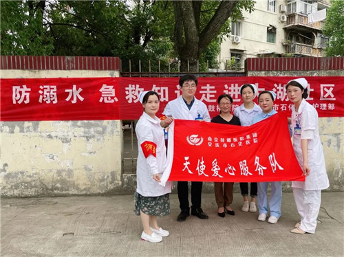 天使愛(ài)心服務(wù)隊(duì)成員門(mén)診部護(hù)士長(zhǎng)鄭潔、ICU護(hù)士長(zhǎng)殷培、燒傷整形科副護(hù)士長(zhǎng)金莉、團(tuán)員孫津津和吳艷,結(jié)合工作中接診的實(shí)際案例,向社區(qū)居民教授了溺水施救及緊急處理的方法。