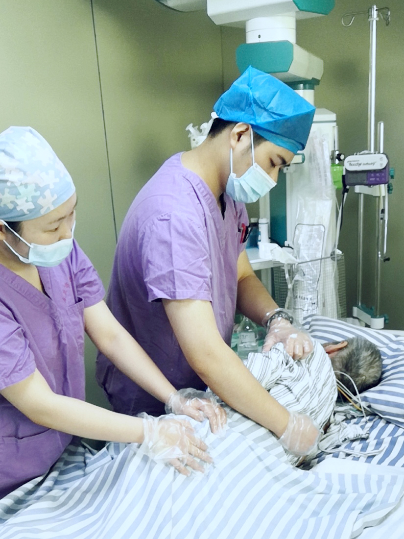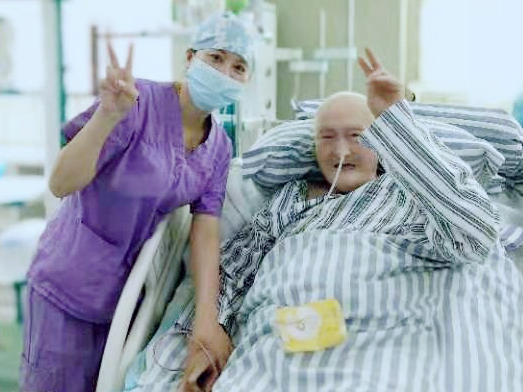 7床的爹爹是ICU里一個(gè)比較特別的患者,九十多歲的高齡,瘦弱的身軀,先后兩次徘徊在死亡的邊緣線,卻從未放棄與病魔抗?fàn)?。他還是ICU公認(rèn)的最“潮”爹爹,最愛(ài)的解悶方式就是用手機(jī)看視頻,他樂(lè)觀向上的心態(tài)也感染了全科醫(yī)護(hù)人員。在ICU眾人的悉心照護(hù)和鼓勵(lì)下,他積極配合治療,始終堅(jiān)強(qiáng)面對(duì),病情逐漸穩(wěn)定。