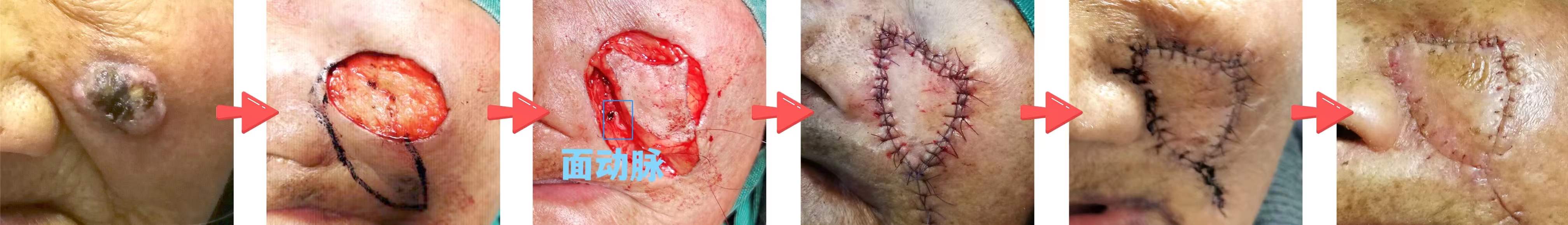 手術(shù)當(dāng)天,切除瘤體后,術(shù)中快速冰凍切片報(bào)告為鱗狀細(xì)胞癌,與楊中目醫(yī)生的判斷基本吻合。由于夏婆婆面部缺損較大,耳鼻咽喉頭頸外科學(xué)科帶頭人汪文曉與楊中目副主任醫(yī)師等人通力合作,以面動(dòng)脈為滋養(yǎng)血管的“島狀”皮瓣修復(fù)創(chuàng)面。在病理科、麻醉科、醫(yī)學(xué)影像科、功能檢查科、檢驗(yàn)室、心血管內(nèi)科、呼吸與危重癥醫(yī)學(xué)科等科室的支持下,手術(shù)順利完成。術(shù)中,夏婆婆睡了一會(huì)兒,醒來時(shí)以為手術(shù)還沒開始,但其實(shí)已經(jīng)結(jié)束,夏婆婆直呼“真的一點(diǎn)感覺都沒有”。