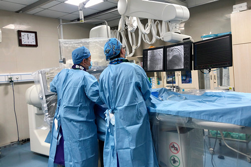 患者躺在導(dǎo)管室的床上,胸悶、呼吸困難非常明顯,患者極度不適,不能平臥,一度想坐起來。考慮患者出現(xiàn)了“急性左心衰”的危急癥狀,團(tuán)隊(duì)冷靜地予以“嗎啡、重組人腦利鈉肽、呋塞米”等處理后,患者癥狀稍緩解。事不宜遲,團(tuán)隊(duì)果斷決定為患者緊急植入“IABP”(主動(dòng)脈球囊反搏泵)提供循環(huán)支持,患者在IABP支持下病情稍穩(wěn)定。