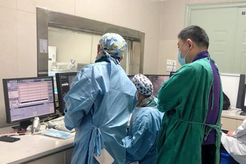 急診科大夫立即行心電圖檢查,心血管內(nèi)科會(huì)診后考慮 “急性心肌梗死”, 符合“左主干”病變的心電圖特點(diǎn),且伴有高血壓病,病情危重。由汪念東副院長帶領(lǐng)的石化醫(yī)院心血管內(nèi)科團(tuán)隊(duì)為患者開通綠色通道,將其緊急送至導(dǎo)管室。李阿姨非常信任地聽取了醫(yī)生的建議。