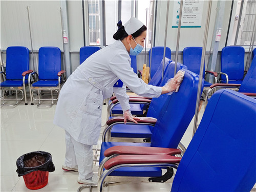 輸液室組長蔣海燕堅持每天提前到崗,仔仔細細地用消毒液擦凈每一張座椅,確?;颊呔歪t(yī)安全。