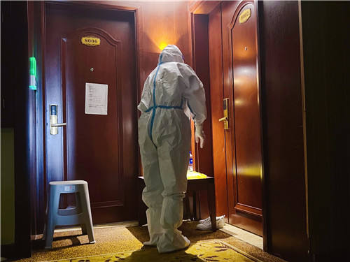 菱北門診部護士長王君先后2次在不同隔離點參與保障工作,負責核酸采集運送、醫(yī)療垃圾收取、為隔離人員送餐。