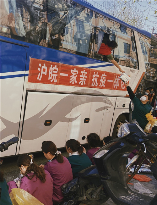 50名醫(yī)護緊急馳援上海,圓滿完成上級交派的任務,連夜返回安慶,依規(guī)集中隔離。圖為結(jié)束一天的任務后,大家在集合的大巴處用餐。