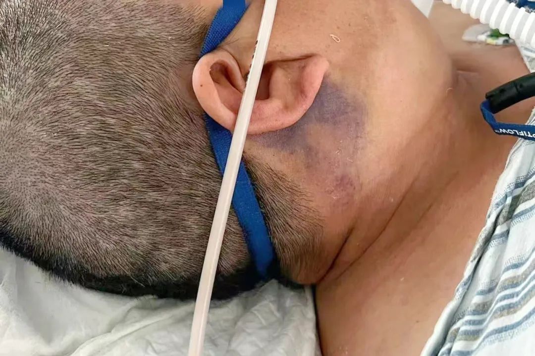 圖中患者已脫離呼吸機,正使用經(jīng)鼻高流量氧療中,可見耳后大片皮下瘀血