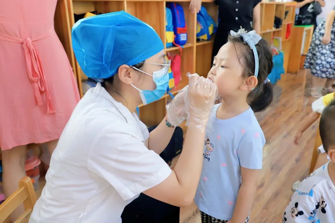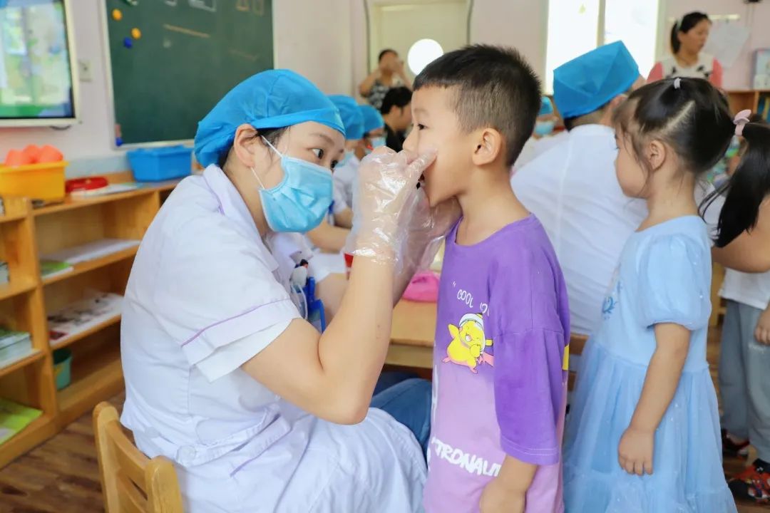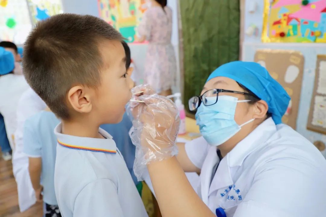在老師的引導(dǎo)下,小朋友們有序排隊,一組醫(yī)生檢查口腔情況,另一組醫(yī)生為小朋友進(jìn)行牙齒局部涂氟,高效配合,活動有條不紊地進(jìn)行著。