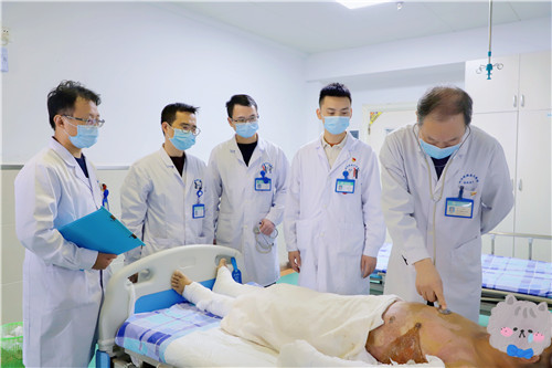 在連續(xù)多日24小時嚴(yán)密監(jiān)測及治療后,患者平穩(wěn)度過休克期。根據(jù)患者大面積特重度燒傷病情,燒傷整形一病區(qū)團(tuán)隊決定為該患者行手術(shù)治療。因燒傷程度嚴(yán)重,治療風(fēng)險大,李主任和團(tuán)隊反復(fù)研究病情,預(yù)估手術(shù)風(fēng)險,制定治療方案,最終決定分多次手術(shù)。