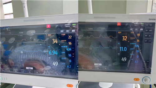治療前后對(duì)比:患者每分鐘通氣量明顯增加,血氧飽和度顯著改善