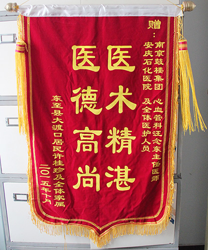 近日,我院收到患者贈送的多面錦旗。普通外科尹衛(wèi)民副院長、吳爾水主任、操海寶、芮悅醫(yī)生及全體醫(yī)護、心血管內(nèi)科汪念東主任及全體醫(yī)護均獲得患者贊揚。