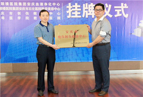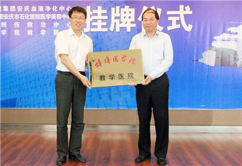 5月26日上午,我院在多功能廳舉辦院慶2周年暨“蚌埠醫(yī)學院教學醫(yī)院”、“安慶市燒傷創(chuàng)傷救治中心”、“南京鼓樓醫(yī)院集團血液凈化中心”、“南京鼓樓醫(yī)院集團安慶市石化醫(yī)院醫(yī)學美容中心”系列掛牌儀式。蚌埠醫(yī)學院、南京鼓樓醫(yī)院、安慶市衛(wèi)計委、金陵藥業(yè)部分領導蒞臨指導,院領導班子全體成員、全院班組長以上干部參加。