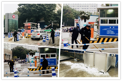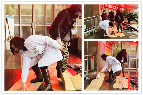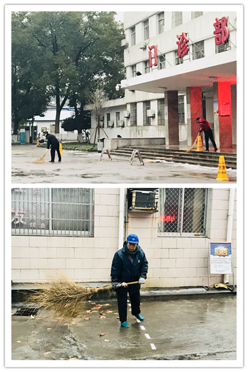 1月25日清晨地面濕滑,部分路面上凍,有很多醫(yī)護(hù)人員都選擇了走路上班。為保障患者和員工的健康安全,預(yù)防暴雪來臨,我院高度重視,積極應(yīng)對(duì),保安、保潔人員不厭其煩、一遍遍清掃主干道路積雪、冰碴,嚴(yán)防進(jìn)一步結(jié)冰;行政綜合科工作人員在濕滑的臺(tái)階、路面鋪墊紙板、布?jí)K,做好一切防滑措施。