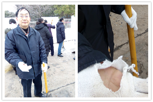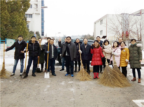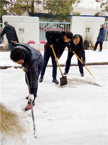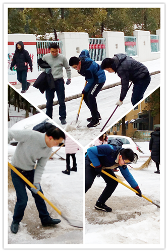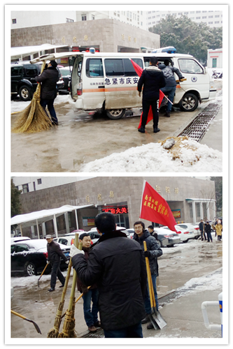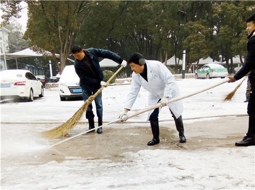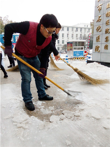 又是一夜的大雪,嚴(yán)嚴(yán)密密地將大地鋪裹上厚重的銀裝。因天寒地凍,雪塊硬如石頭,路面光滑如鏡,無人行,無車動。1月28日早晨6:30分,為給患者、員工、市民開辟“安全無障的道路”,由干部、黨員、積極分子組成的石化醫(yī)院突擊隊又一次投入除冰掃雪的戰(zhàn)斗,鐵釬叮嚀、鐵鍬飛舞,院內(nèi)、廠區(qū)、市區(qū)德寬路留下了他們戰(zhàn)天斗地的歡快身影……