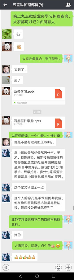 一次晨會上,護士長提出在晚間下班時間進行科內(nèi)微信護理查房,經(jīng)過討論,大家一致同意,認為這種形式既能解決目前沒有合適學習地點的問題,還節(jié)約了大家往返醫(yī)院的時間。近半年來,科室在崗人員不足,患者多,倒班勤,休息時間本就有限,所以,對于這種新查房模式,大家很是期待。